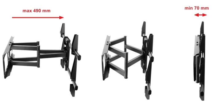 - możliwość ustawienia dowolnej pozycji telewizora zarówno bardzo blisko 70 mm jak i daleko od ściany 490 mm